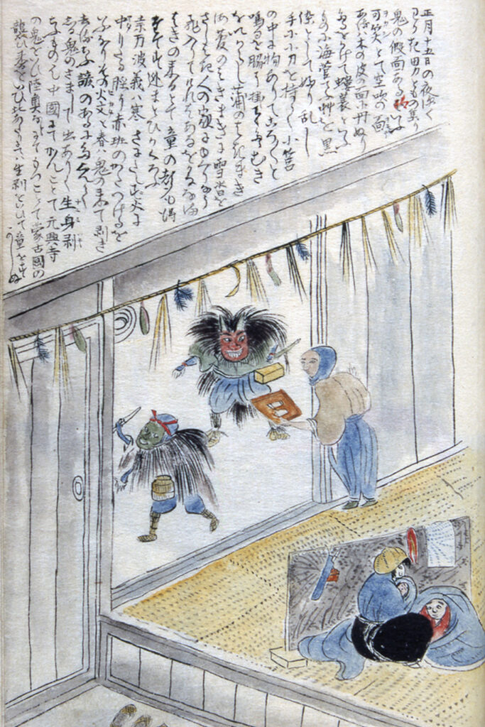 The oldest written source about the Namahage appears in the travelogue “Oga’s Cold Winds”, published by Sugae Masumi (菅江真澄) in 1811. The illustrated description, which you can see beside the text, reads as follows: