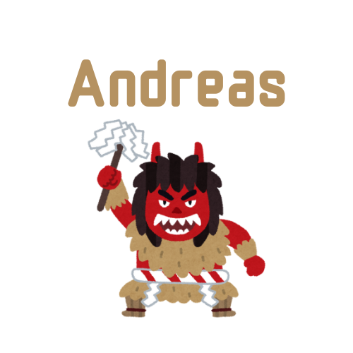 Andreas is the first (and only as of 2025) foreigner ever to be certified as a Namahage Professor/Missionary, or Namahage Dendōshi (なまはげ伝道師) in Japanese. The certification is earned through a written exam offered once a year on Oga and confirms that the holder knows enough about the Namahage to teach and inform others about it. In addition, he has completed training as a guide for the Oga Peninsula.